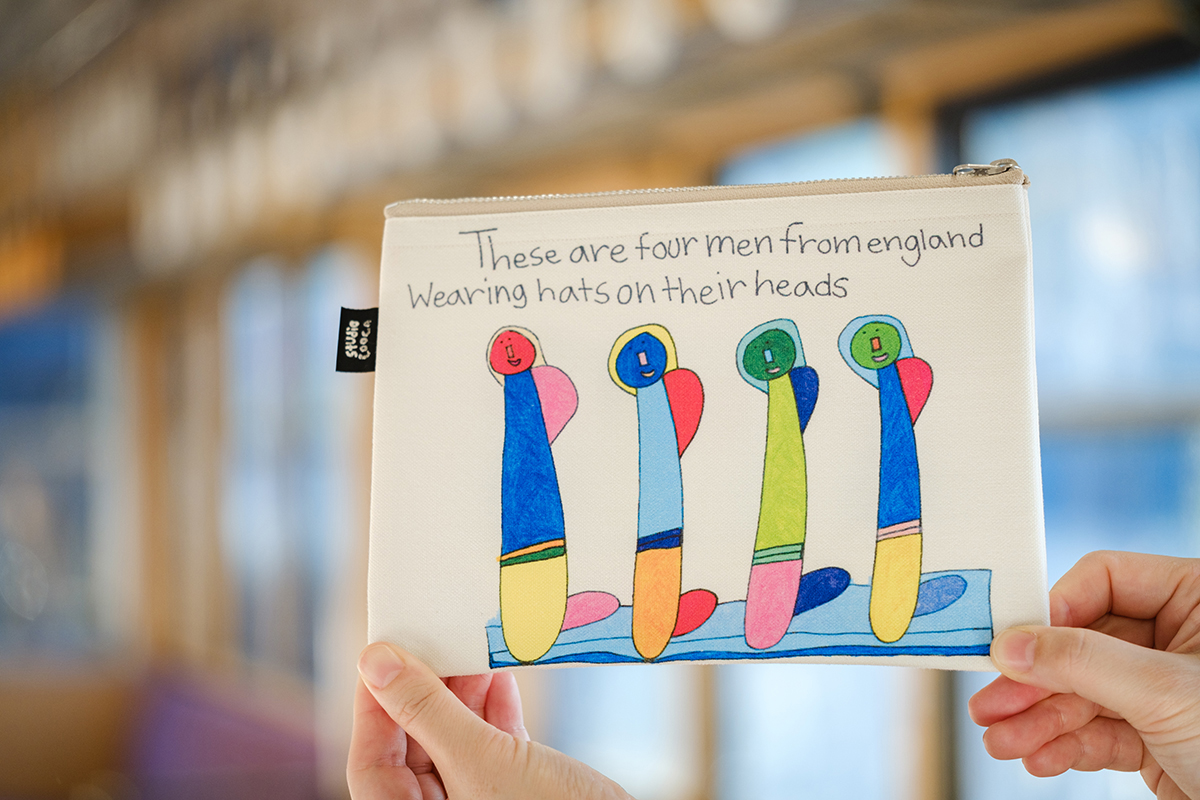 アトリエは小田原の森林が多い久野地区にあり、アーティストのみなさんは散歩や外遊びをしながら創作されているといいます。そんな楽しそうな空気が伝わってくる作品が魅力です。今回は原画のほか、一筆箋、ペンケース、バッグ、ネクタイなど、身近に使えるアイテムをご用意しております。