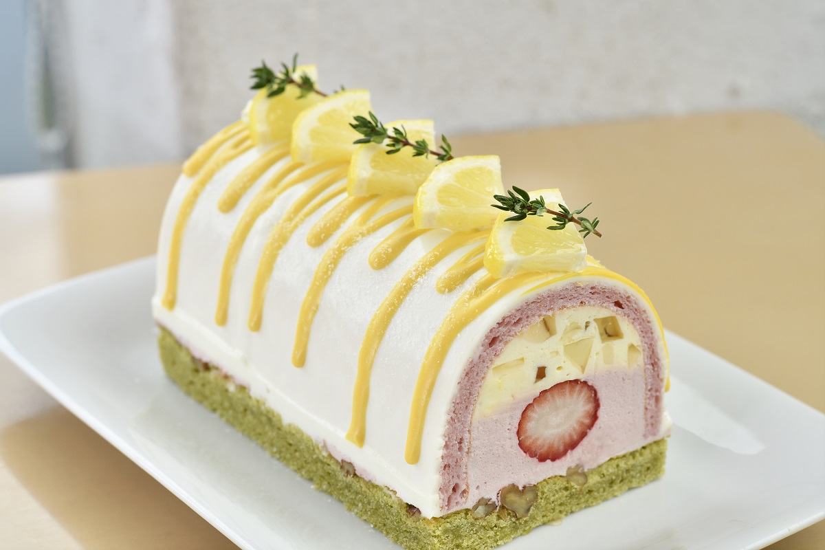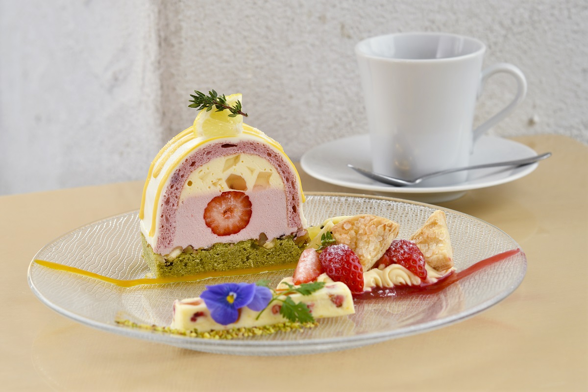 華やかな色合いとゼリーできらめきを表現。苺やレモンのムース、小田原産百花蜜を使ったゼリーや大山茶入りのパウンド生地など、多彩な味わいが重なるケーキにパイやジェラートも添え、宝探し気分で食べ進められます。