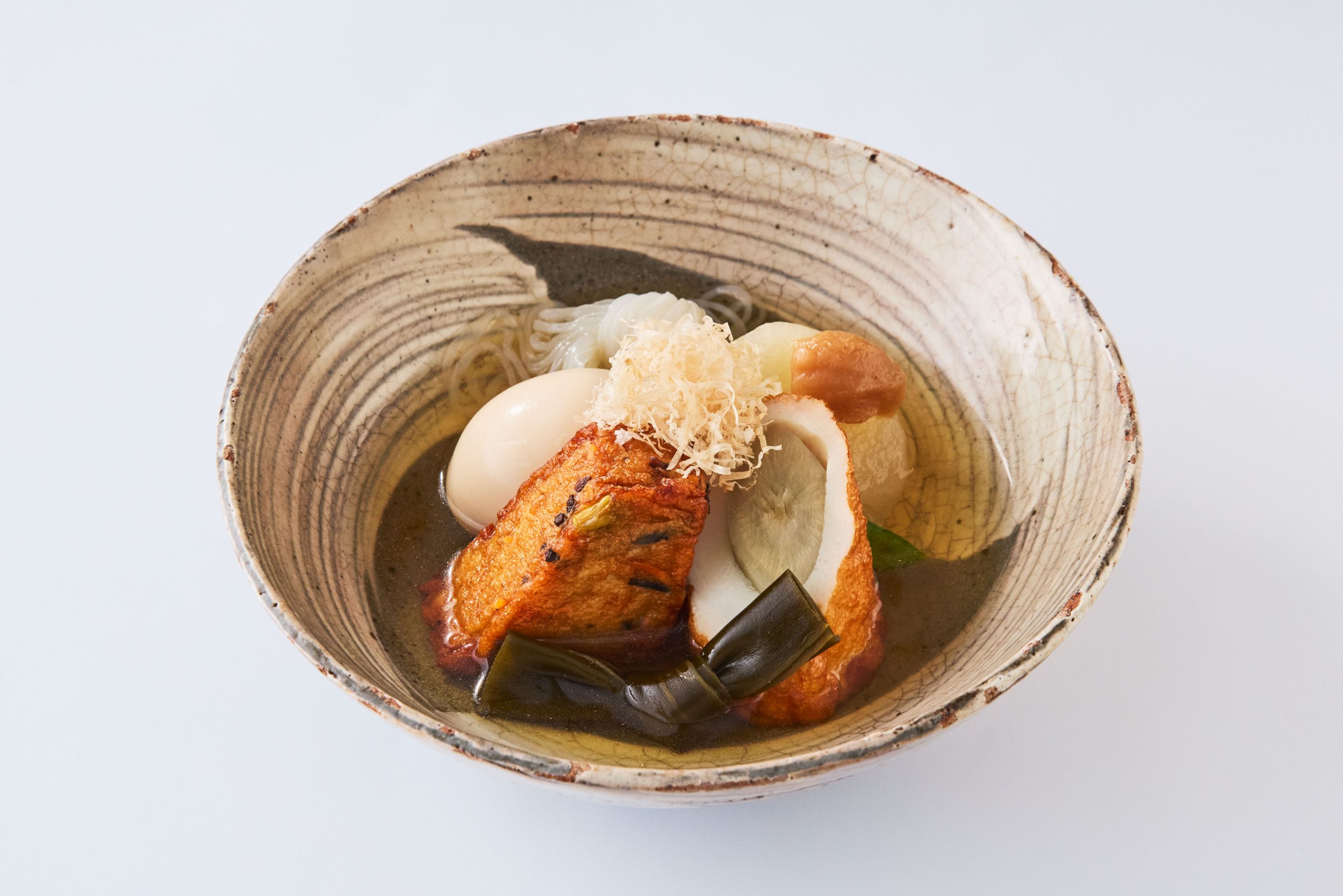 出汁は鈴廣特製つゆをベースに、奥深い味わいに。地元・小田原「加藤兵太郎商店」の梅味噌をつけていただきます。出汁をたっぷり含んだおでんに、梅味噌のきりっとした酸味とコクが絶妙に調和します。