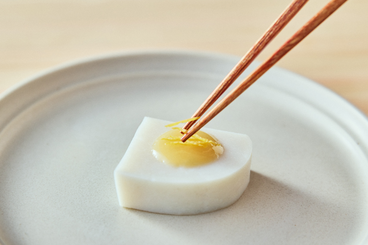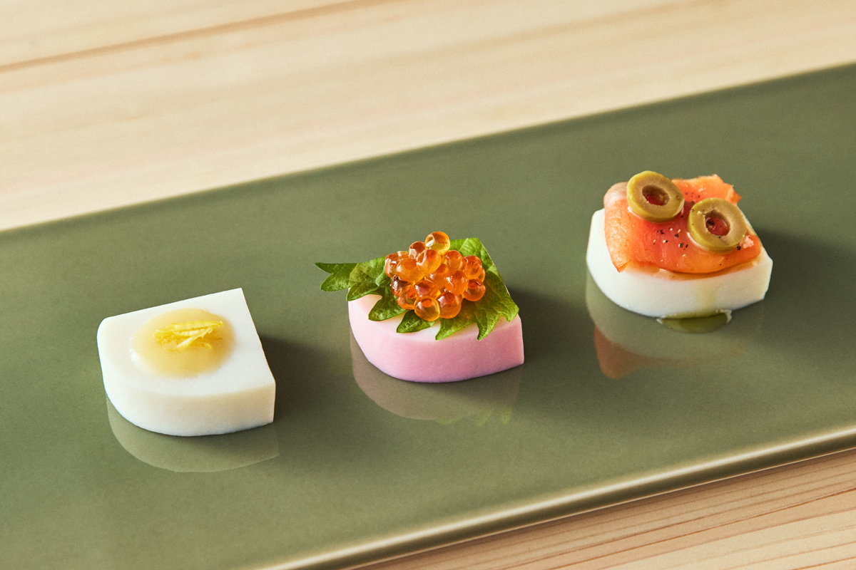 ぷりっとした弾力を楽しむピンチョスには「謹上蒲鉾」をおすすめしております。しなやかな弾力を生む旬のグチをメインに、季節に応じてタイ類やタラ類の魚をブレンド。化学調味料や香料などももちろん使わず、白身魚の本来の味わいをゆっくりお楽しみください。