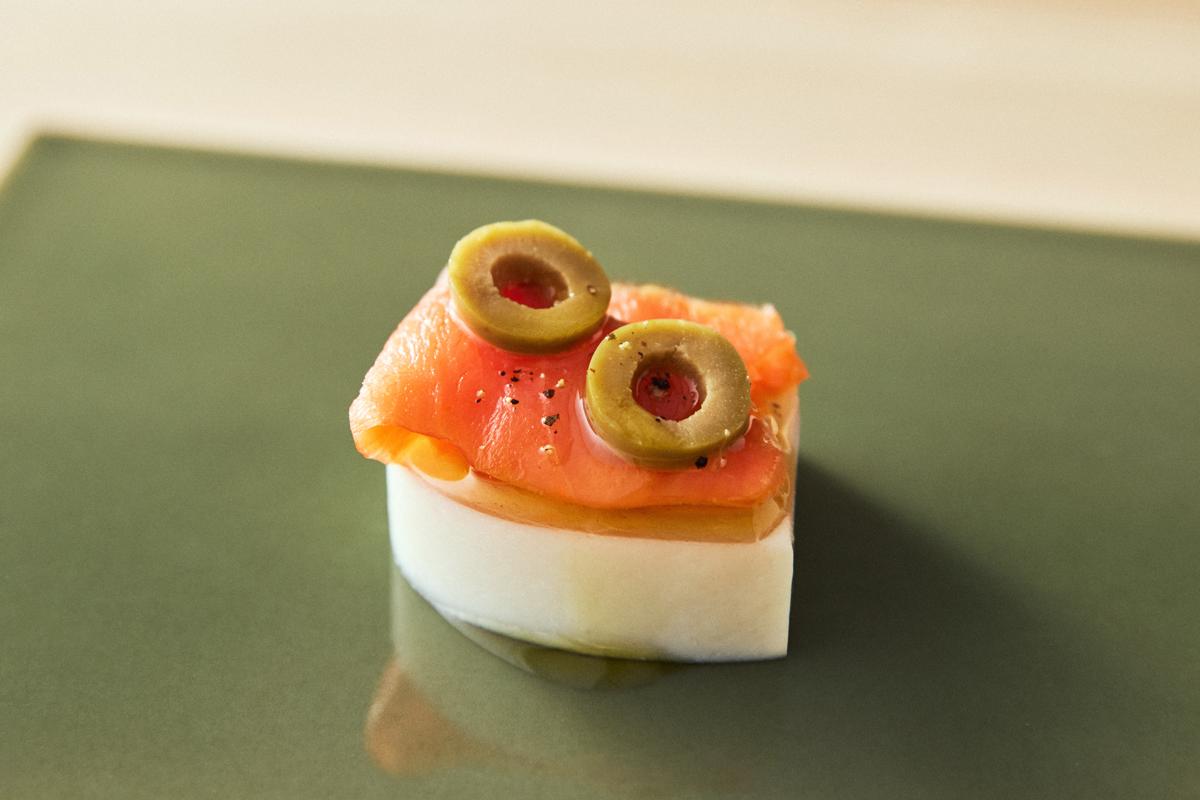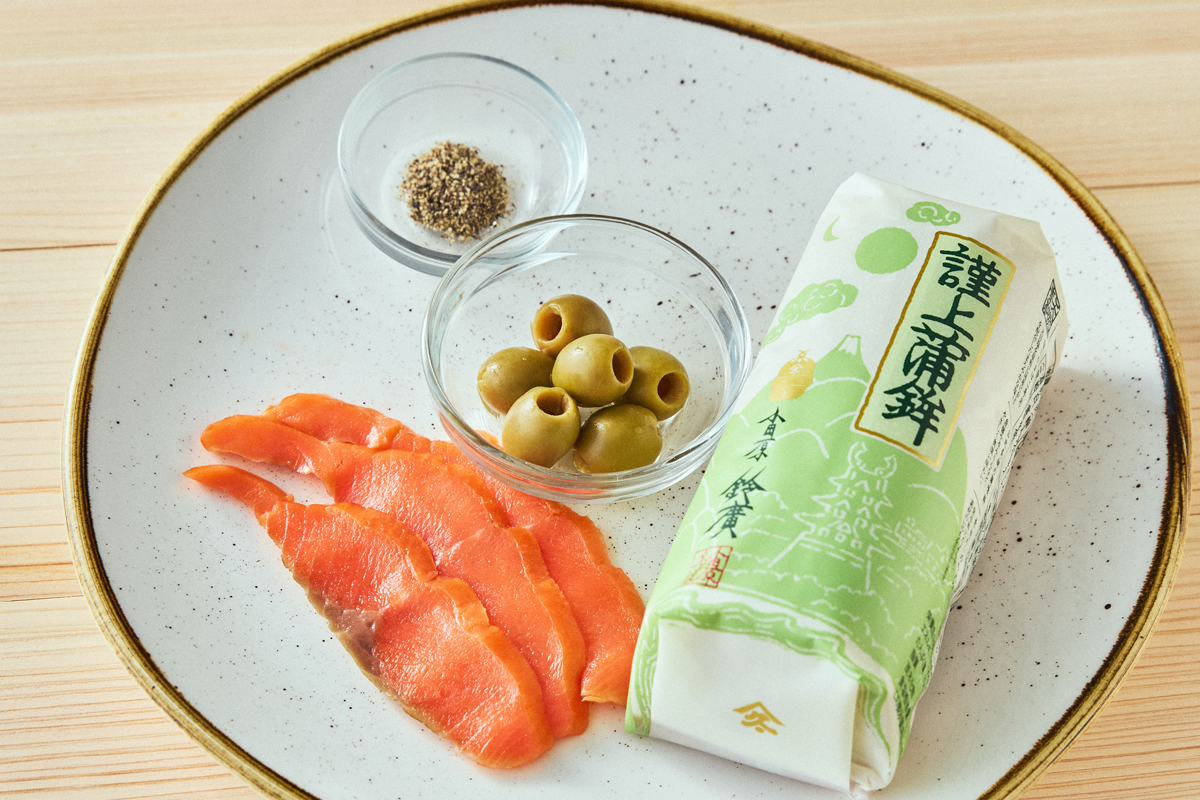 ③ スモークサーモンと切ったオリーブをかまぼこにのせる。