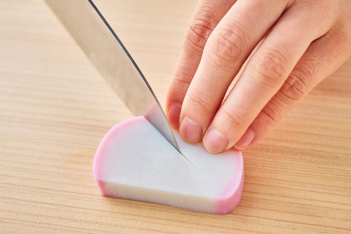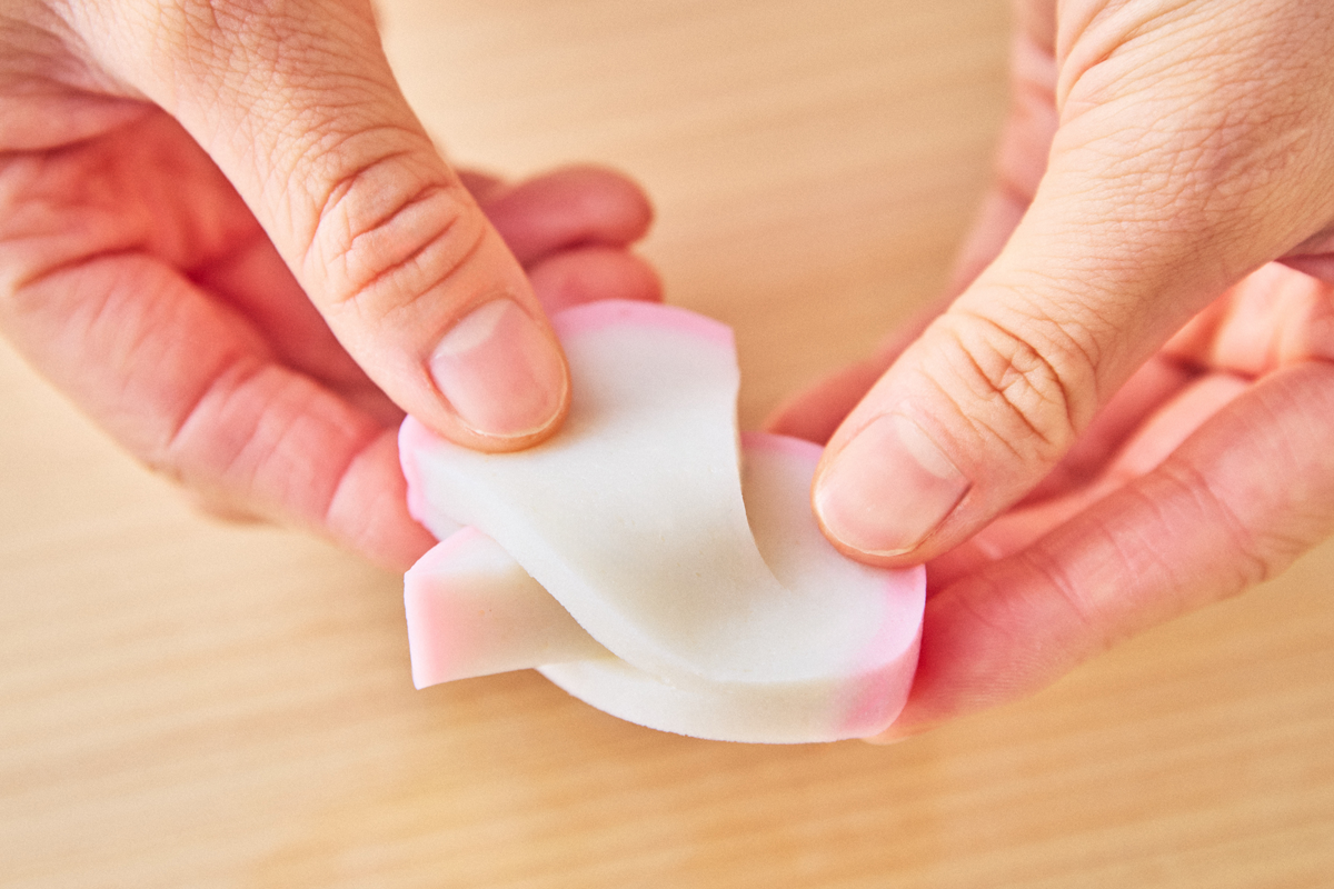 かまぼこの曲線美をお雑煮やおせちに添えて。 飾り切りにはしなやかな伝統石臼製法の「特上蒲鉾」