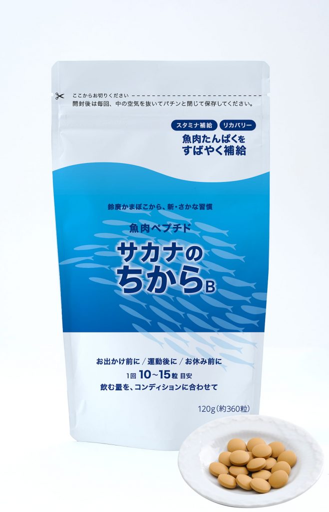 鈴廣かまぼこ開発の「サカナのちからB ベーシック」は、天然素材と自然な製法でつくられたサプリメントです。白身魚のすり身を酵素で分解した「魚肉ペプチド」でできており、20種のアミノ酸を素早く効率良く補給することができます。